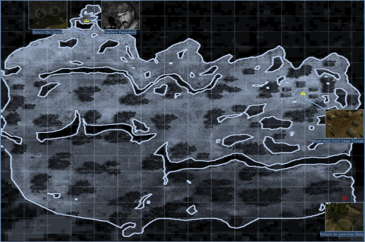 Our first mission is a raid on a rebel base in the Caucusus Mountains. A rebel leader named Bakur Papashvili has been attacking army convoys across the Terek River. You'll need to take out his guard posts first, then hit his main camp. You'll find Papashvili in the caves at the top of the hill where he's set up a command center. Take him alive if you can, but remember that he won't surrender unless all his guards are eliminated.