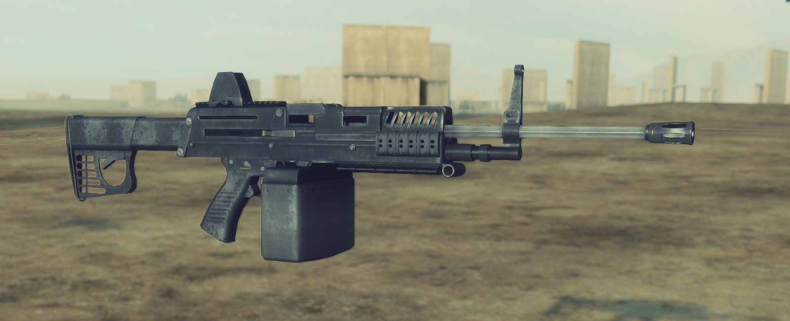 The developmental LSAT (Lightweight Small Arms Technologies) Light Machine Gun is usable by The Ghosts in the MP. It is unknown why the stock cannot be collapsed. Instead, it can be fitted with a "fixed" stock, that looks like an AR-15 type LE stock with some modifications.