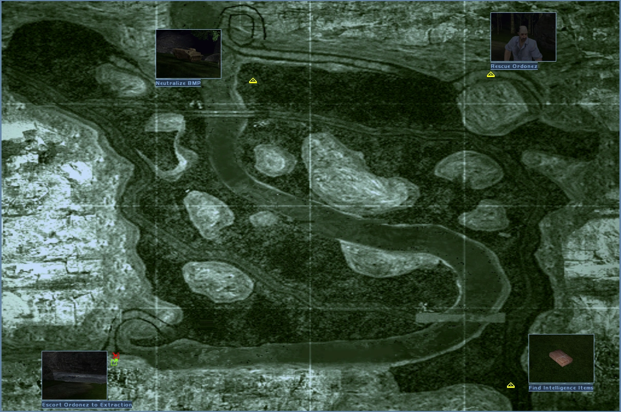 Your mission is to rescue Ordonez and get those papers. Find where he hid the parcel, then find him and bring him back alive. Our first flyover of the region showed that they'd moved a BMP in, so you may want to take that out as well. Remember, they're not going to keep Ordonez alive much longer, so there's a real time pressure on this one. Best of luck to you, gentlemen. Now get to work.