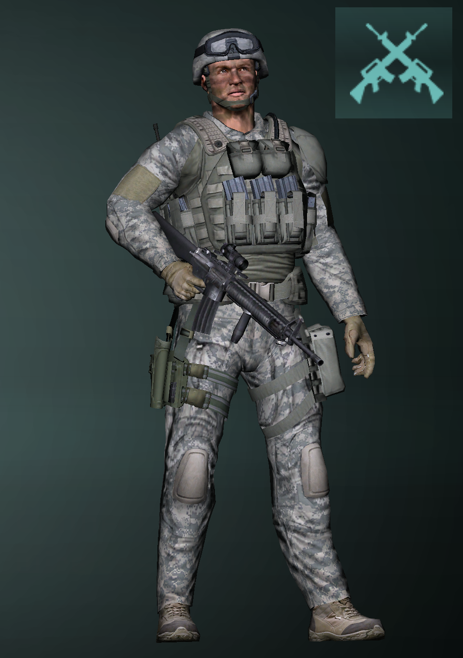 The Rifleman class enjoys accuracy bonuses while standing or moving, greater accuracy, quicker reload times, and additional ammunition from Rifleman weapons.